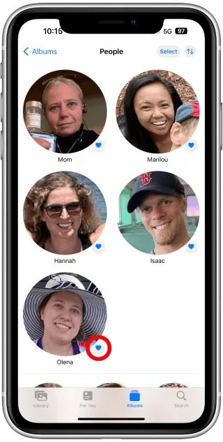 3. Nếu bạn đã đánh dấu bất kỳ người nào là mục ưa thích, bạn sẽ thấy ảnh của họ ở đầu màn hình trong các vòng tròn lớn. Nhấn vào trái tim màu xanh để hủy yêu thích chúng.