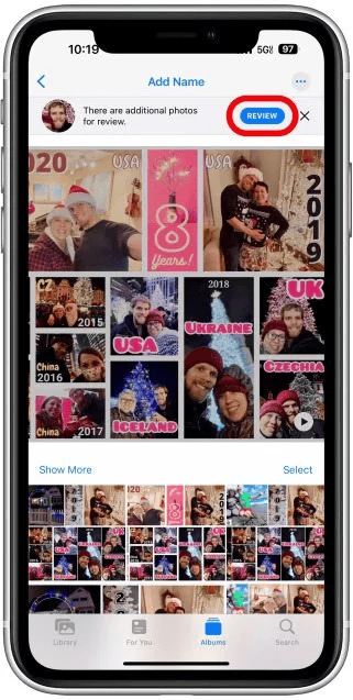 5. Nếu bạn thấy một số nhận dạng khác nhau cho cùng một người, bạn có thể hợp nhất chúng. Để thực hiện việc này, hãy nhấn vào vòng tròn có ảnh của họ. Nếu bạn thấy tùy chọn xem lại ảnh bổ sung của người này, hãy nhấn XEM LẠI.