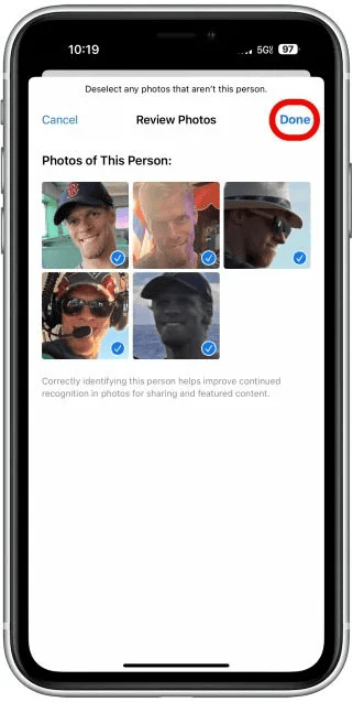 6. Chọn hoặc bỏ chọn các ảnh có liên quan, vòng tròn màu xanh có dấu kiểm cho biết ảnh đã được chọn. Một vòng tròn trống cho biết rằng hình ảnh không được chọn. Khi bạn đã chọn ra tất cả hình ảnh của đúng người, hãy nhấn Xong. Trong trường hợp của mình vì mình đã có người này được đặt tên là một liên hệ, nên việc này đã hợp nhất những ảnh này với những ảnh đã được xác nhận trước đó.