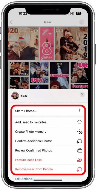 7. Nếu bạn nhấn vào menu Khác, bạn có thể chia sẻ tất cả ảnh của người này, Thêm (Tên) vào Mục ưa thích, Tạo Kỷ niệm ảnh, Xác nhận ảnh bổ sung, Xem lại các ảnh đã xác nhận,… Nếu bạn xem qua mọi liên hệ và xem xét kỹ lưỡng các ảnh bổ sung và đã xác nhận, điều này sẽ cải thiện độ chính xác của bất kỳ nhận dạng người nào trong tương lai và sẽ giúp bạn dễ dàng tạo các Ảnh kỷ niệm và Màn hình khóa ảnh hơn.