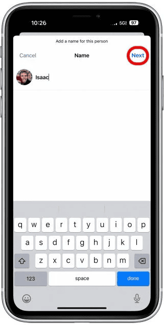 8. Để đặt tên hoặc đổi tên một liên hệ, hãy nhấn vào họ trong album Mọi người rồi nhấn vào tên của họ ở trên cùng. Tại đây, bạn có thể thay đổi chính tả và cách viết hoa, thậm chí thêm biểu tượng cảm xúc. Khi bạn đã hoàn tất, hãy nhấn vào Tiếp theo. Sau đó, nhấn Xong để xác nhận.