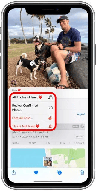 11. Từ đây, bạn có thể xem Tất cả ảnh của người đó, Xem lại ảnh đã xác nhận để cải thiện độ chính xác, Giảm bớt tính năng hoặc nhấn vào Đây không phải (Tên) nếu thẻ không chính xác. Điều này cũng có thể được thực hiện nếu thẻ chính xác, nhưng bạn không muốn hình ảnh được gắn thẻ nếu nó là riêng tư.