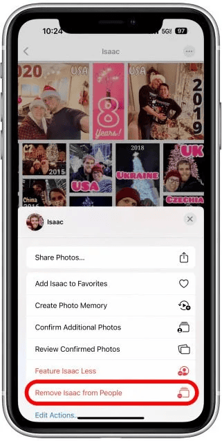 11. Nếu bạn muốn “xóa mọi người khỏi ảnh” trong Memories, Featured Photos, quay lại bước 7 của phần thứ hai và chọn Remove (Name) From People. Nếu bạn muốn ẩn ai đó tạm thời, bạn có thể di chuyển tất cả ảnh của họ vào album Ẩn mà mình sẽ nói trong phần Bước 6 bên dưới.
