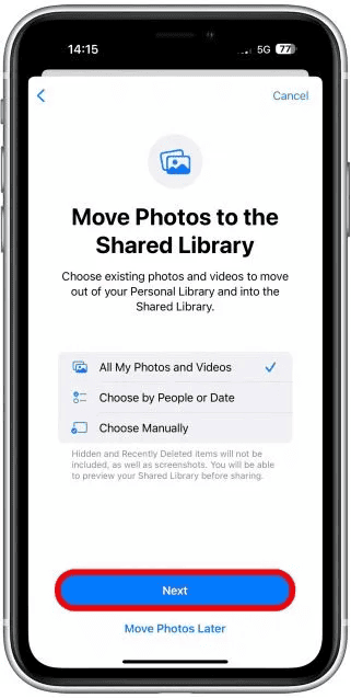 2. Sẽ có một bước mà bạn có thể quyết định xem bạn muốn chia sẻ tất cả ảnh và video, những người hoặc ngày đã chọn hay chọn nội dung bạn chia sẻ theo cách thủ công. Hãy suy nghĩ về điều này một cách cẩn thận trước khi bạn chạm vào Tiếp theo.
