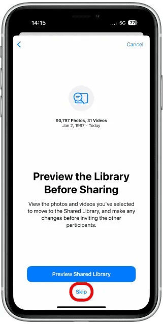 3. Trên màn hình tiếp theo, bạn sẽ thấy có bao nhiêu ảnh và video sẽ được chia sẻ. Bạn có thể chạm vào Xem trước thư viện được chia sẻ để xem chúng hoặc chạm vào Bỏ qua nếu bạn chỉ muốn tiếp tục thiết lập.