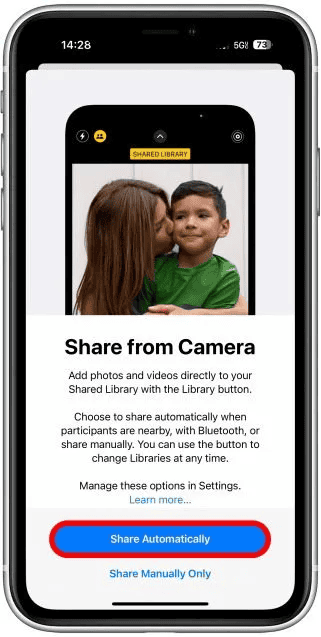 5. Sau khi lời mời được gửi, bạn sẽ có thể quyết định xem bạn muốn chia sẻ bất kỳ ảnh và video mới nào mà bạn chụp Tự động hay Chỉ theo cách thủ công. Mình sẽ chọn tự động, nhưng thay vào đó bạn có thể muốn chia sẻ thủ công.