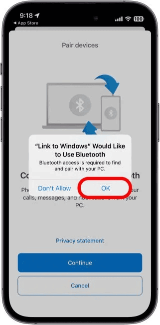 7. Nhấn OK để cho phép ứng dụng sử dụng Bluetooth để kết nối với PC của bạn.