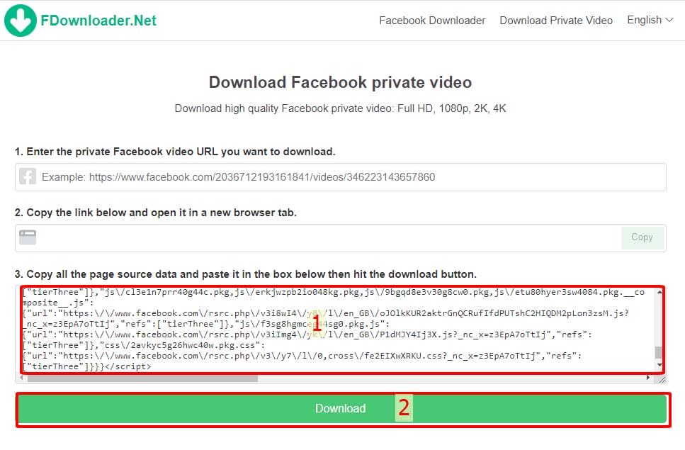 Mở trang web https://fdownloader.net/vi/download-private-video và dán mã nguồn đã sao chép vào hộp nhập liệu số 3 sau đó nhấn nút “Tải xuống“.