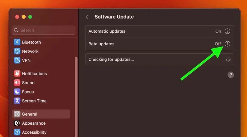 8. Nhấp vào biểu tượng thông tin (chữ “i” được bao quanh) bên cạnh Bản cập nhật Beta.