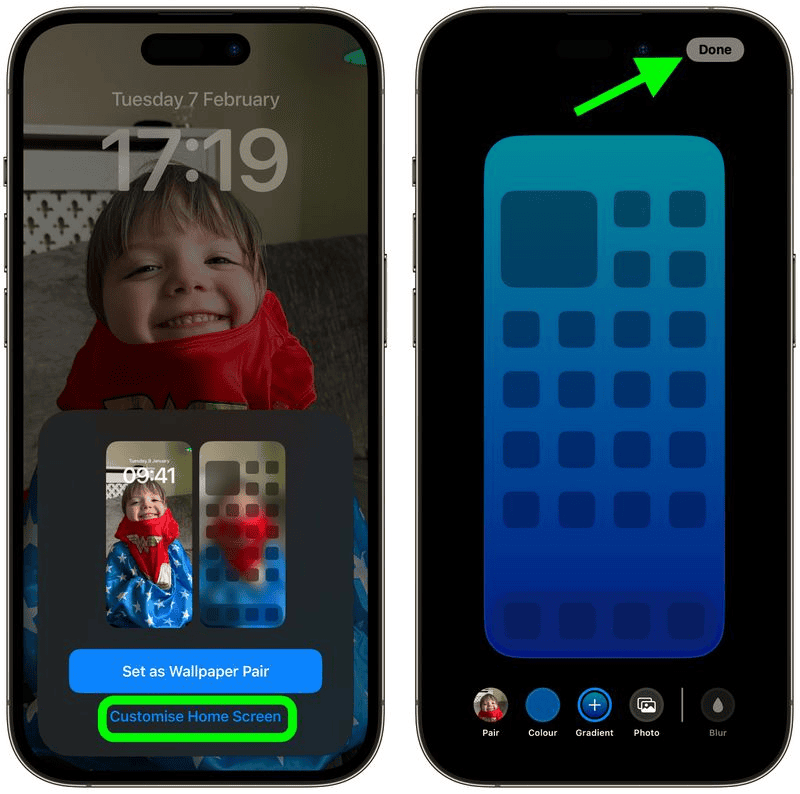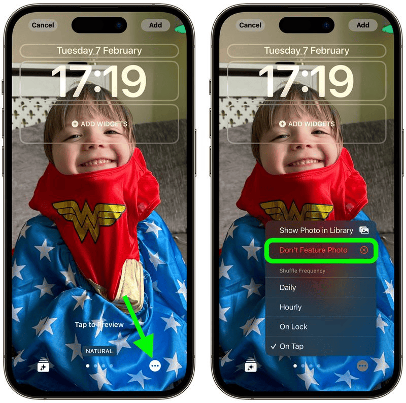 Khi bạn hài lòng với Màn hình khóa ngẫu nhiên mới của mình, hãy chạm vào Thêm ở góc trên cùng bên phải, sau đó chọn Đặt làm cặp hình nền hoặc Tùy chỉnh Màn hình chính. Nếu bạn chọn tùy chọn cũ, chỉ cần nhấn vào Màn hình khóa mà bạn vừa tạo để hiển thị.