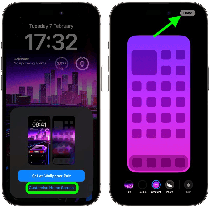 Nếu bạn chọn tùy chọn thứ hai, bạn sẽ được đưa đến một bộ công cụ cho phép bạn thay đổi màu sắc và độ dốc của hình nền Màn hình chính một cách độc lập hoặc thậm chí chọn hoàn toàn một hình ảnh khác cho nó. Khi bạn tùy chỉnh xong, hãy nhấn vào Xong ở góc trên cùng bên phải.