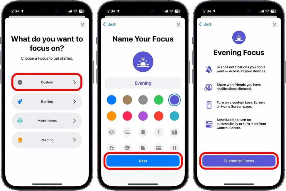 Bước 12: Đặt tên cho chế độ Tập trung của bạn, đồng thời chọn màu và biểu tượng đi kèm với tiêu điểm đó.