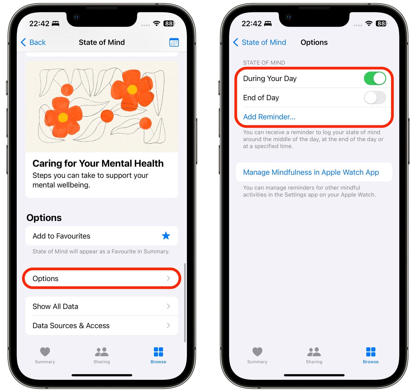 Ở cuối phần Trạng thái tâm trí là menu Tùy chọn bao gồm các nút chuyển đổi mà bạn có thể bật để nhận lời nhắc ghi lại trạng thái cảm xúc hoặc tâm trạng của bạn trong ngày hoặc vào cuối ngày.
