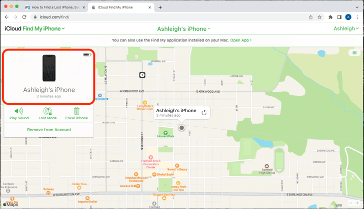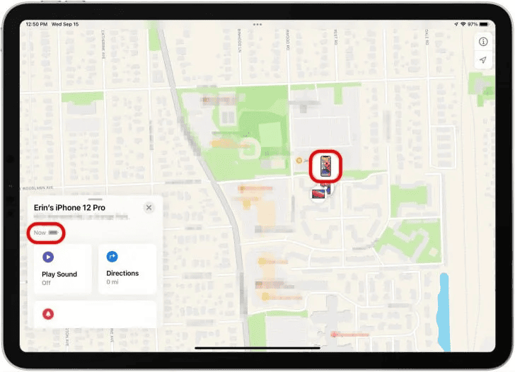 3. Nếu iPhone bị mất của bạn đã hỏng, nó sẽ xuất hiện trên bản đồ dưới dạng iPhone có màn hình đen và bạn sẽ thấy văn bản màu đỏ trong thanh bên cho bạn biết khi nào vị trí đã biết gần đây nhất Tìm iPhone của tôi được lưu.
