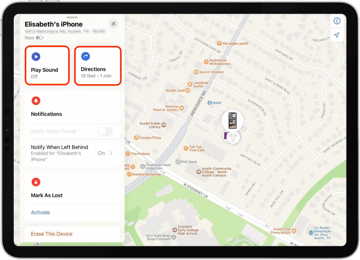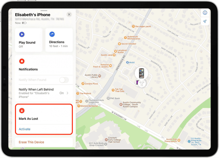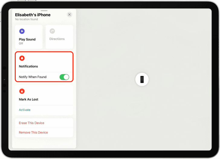 7. Nếu iPhone đã hỏng, bạn có thể bật Thông báo khi tìm thấy để gửi thông báo và cập nhật vị trí cho iPad của bạn vào lần tới khi iPhone bị mất của bạn được bật.