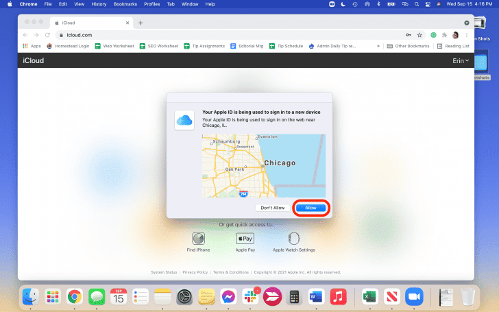 2. Nếu được nhắc, hãy nhấp vào Cho phép để cho phép sử dụng iCloud.com trên thiết bị bạn đang sử dụng và hoàn tất ủy quyền hai yếu tố.