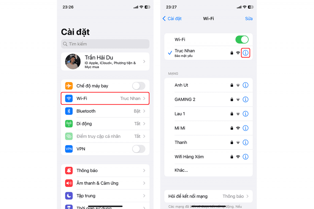 Bước 1: Đi tới Cài đặt (Settings) > Wi-Fi trên iPhone của bạn. Tại đây, hãy nhấn vào biểu tượng “i” bên cạnh mạng Wi-Fi đang hoạt động hoặc biểu tượng hiển thị trong Mạng của tôi (My Networks). Sau khi làm điều này, nó sẽ đưa bạn đến một trang mà bạn có thể xem thêm chi tiết về kết nối của mình.