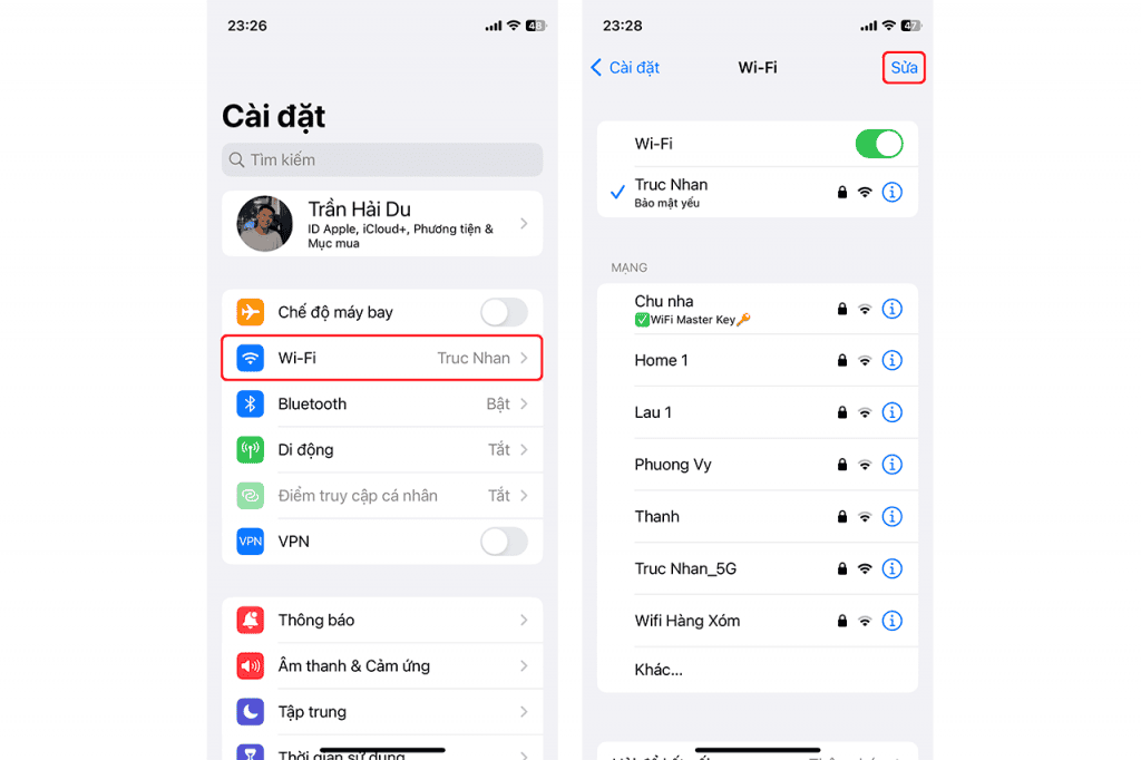 Bước 1: Các bạn vẫn vào Cài đặt (Settings) và tiếp tục vào Wi-Fi trên iPhone của bạn giống như bước 1 cách ban đầu. Sau đó ban nhấn vào nút Sửa trên góc phải màn hình. Lúc này iPhone sẽ yêu cầu xác minh danh tính của bạn bằng Face ID, Touch ID hoặc mật mã.