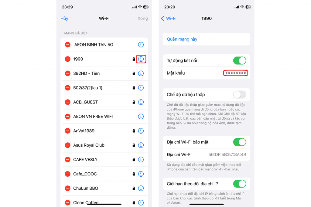 Bước 2: Sau khi đã xác minh xong thì điện thoại sẽ hiện ra giao diện tổng hợp các mạng Wi-Fi mà bạn đã kết nối. Lúc này bạn tìm đến tên Wi-Fi mà bạn muốn lấy mật khẩu, sau đó nhấn vào biểu tượng “i” bên cạnh mạng Wi-Fi, tiếp tục nhấn vào mục mật khẩu bị ẩn để hiện mật khẩu ra. (Bước này không cần xác minh danh tính).