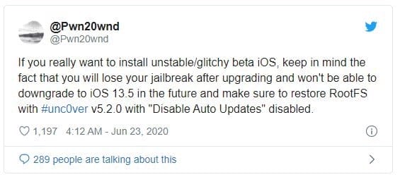 Bất chấp tất cả các cải tiến bảo mật mà Apple giới thiệu trong iOS 13 , có khá nhiều công cụ jailbreak có sẵn cho HĐH. Trên thực tế, bạn vẫn có thể bẻ khóa iOS 13,5 , đây là phiên bản mới nhất của HĐH từ Apple đóng gói tất cả các tính năng và cải tiến mới mà công ty buộc phải giới thiệu do đại dịch COVID-19. Nếu iPhone của bạn đang chạy iOS 13,5 và đã jailbreak, bạn chắc chắn không nên cài đặt iOS 14 beta trên nó. Điều này là do Apple không còn ký iOS 13,5 nên bạn sẽ không thể hạ cấp thiết bị của mình trở lại thiết bị sau khi dùng thử iOS 14. Các tính năng mới trong iOS 14 có thể rất hấp dẫn, nhưng hiện tại chúng hầu hết đang ở trạng thái lỗi. và chắc chắn không đáng để từ bỏ một số tinh chỉnh jailbreak hữu ích.