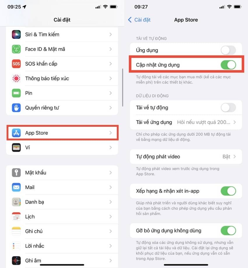 Để thiết lập chế độ cài đặt tự động, bạn cũng cần phải truy cập vào phần Cài đặt, ấn chọn mục Appstore, sau đó bật công tác cho mục Cập nhật ứng dụng. Theo đó mọi ứng dụng trên thiết bị của bạn sẽ được cập nhật khi có các phiên bản mới.