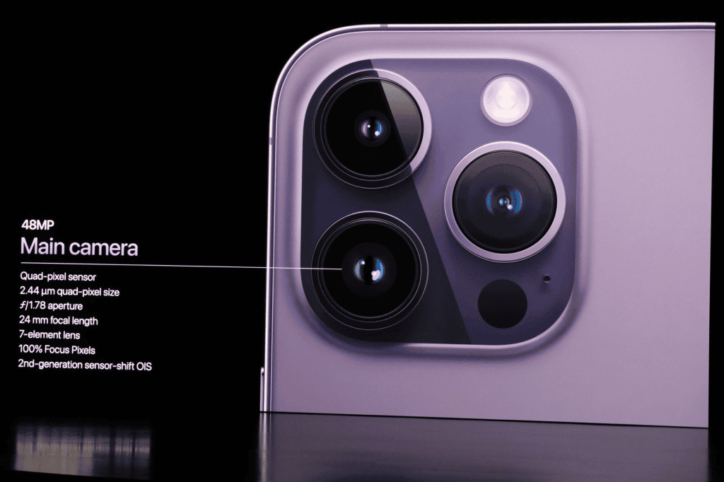 Theo Apple, camera trên iPhone 14 Pro cải thiện khả năng chụp thiếu sáng 2 lần so với thế hệ tiền nhiệm, cho phép thu ánh sáng nhiều hơn tới 4 lần, chụp ProRAW ở 48MP. Camera tele 2X được thêm vào giúp người dùng có thêm sự lựa chọn về tiêu cự. Máy có thể quay 4K@30fps hoặc 4K@24fps, hỗ trợ ProRes.