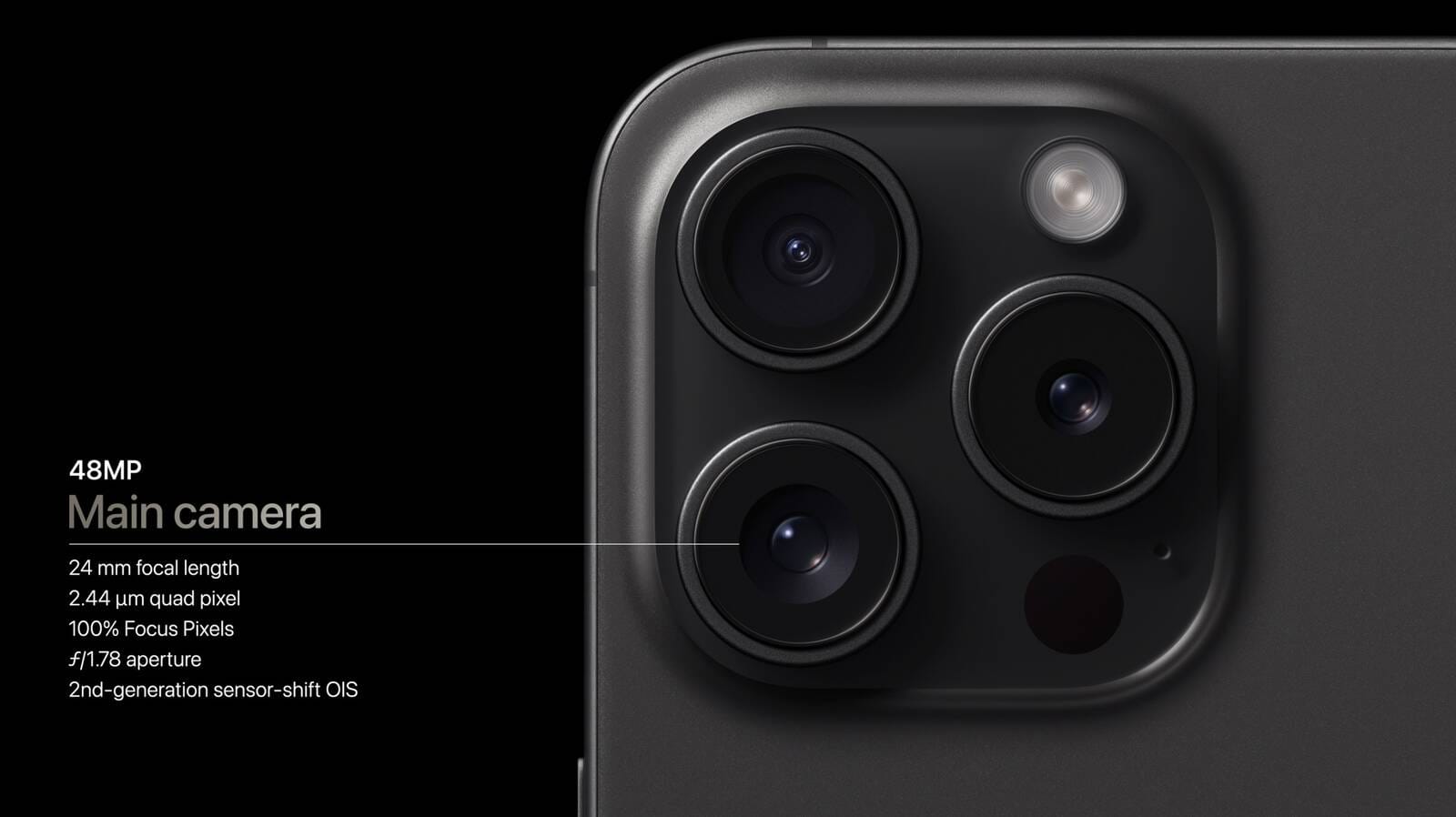 ‌iPhone 15 Pro‌ có hệ thống camera cải tiến. Camera chính có cảm biến lớn hơn, lớp phủ mới để giảm hiện tượng lóa ống kính, hiệu suất ánh sáng yếu tốt hơn cho chế độ Chân dung và Ban đêm, nhiều tiêu cự, chế độ mặc định độ phân giải siêu cao 24MP mới, v.v.