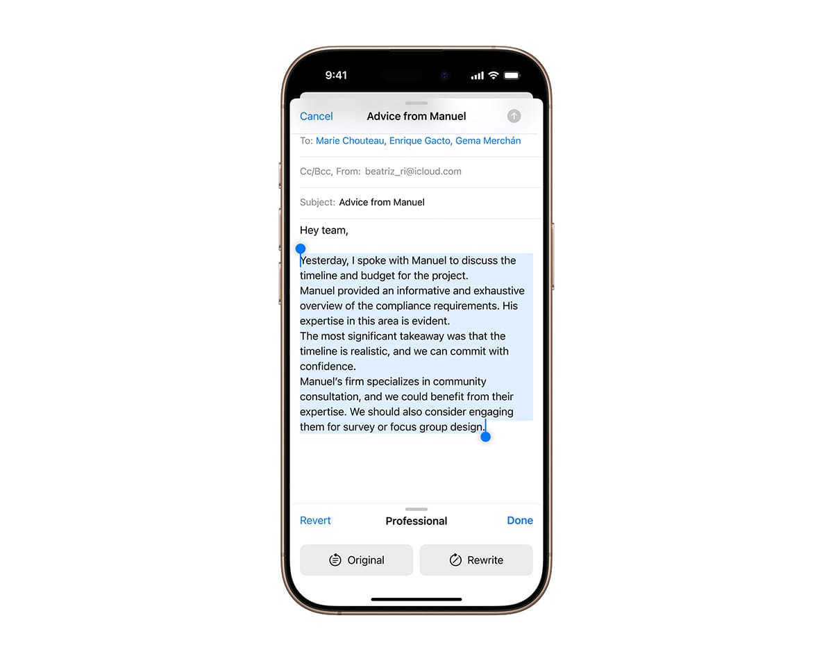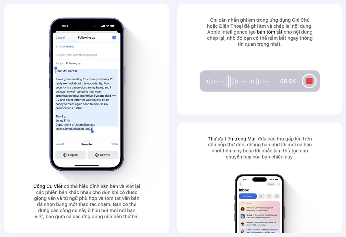 Bạn có thể sử dụng Công Cụ Viết để viết lại, hiệu đính và tóm tắt văn bản, tạo ra những hình ảnh vui nhộn với Genmoji và Image Playground, tóm tắt các thông báo và hiển thị các thư gấp với Thư Ưu Tiên trong Mail, ghi âm, chép lại và tóm tắt âm thanh trong Ghi Chú và Điện Thoại.