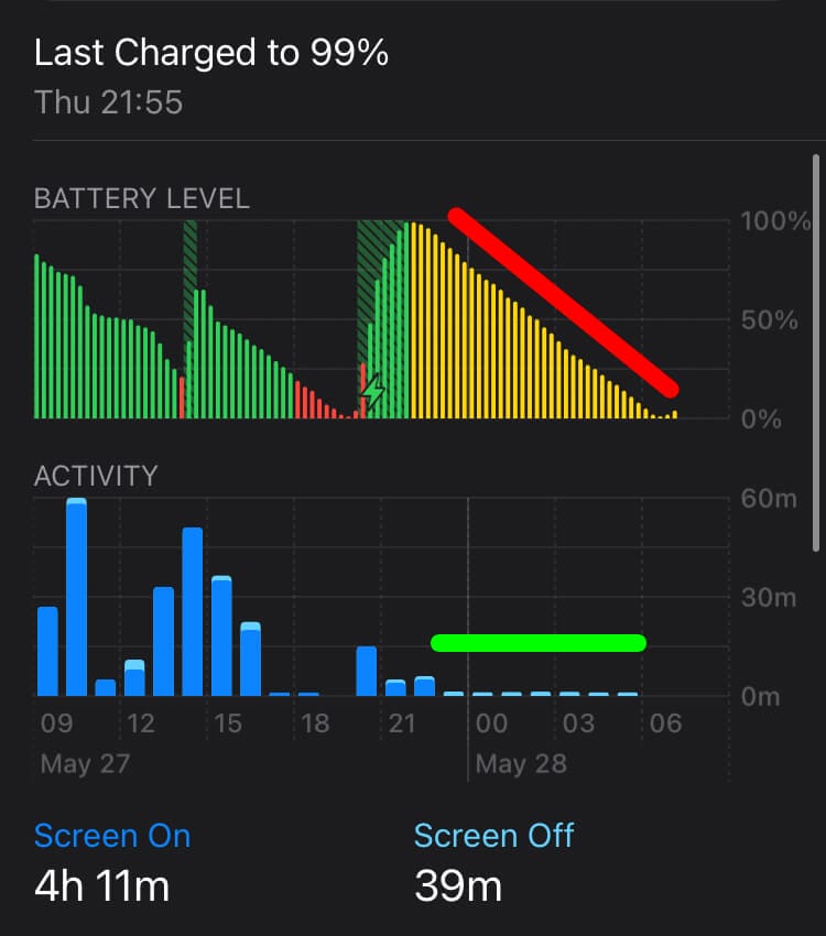 Bạn có thể thấy, chiếc iPhone này phần pin giảm rất nhanh (thanh màu đỏ) tuy nhiên thời lượng sử dụng lại giữ nguyên (màu xanh). Nguyên nhân thường thấy là do xung đột phần mềm, có phần mềm đang chạy ẩn… Cách khắc phục trước tiên là khởi động lại máy và tiếp tục theo dõi.