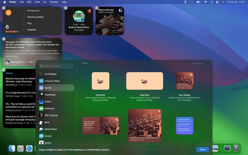 Ngoài ra, nếu bạn nhấp chuột phải vào một khoảng trống trên màn hình nền, menu xuất hiện bao gồm tùy chọn “Chỉnh sửa tiện ích…” mới. Việc chọn tùy chọn này sẽ hiển thị một thư viện tiện ích – nhờ tính năng Continuity mới giữa các thiết bị của Apple – cũng bao gồm các tiện ích từ iPhone của bạn ở tất cả các kích thước có sẵn. Vì vậy, ngay cả khi bạn không có ứng dụng Mac tương ứng, bạn vẫn có thể sử dụng tiện ích iOS ngay trên máy tính để bàn của mình. Chỉ cần kéo nó từ thư viện vào một không gian có sẵn.