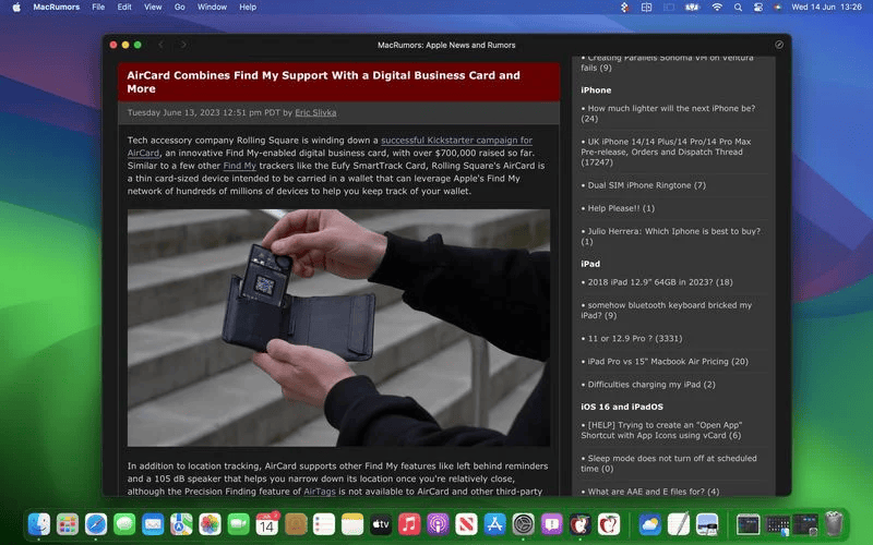 Giờ đây, bạn sẽ thấy ứng dụng web MacRumors nằm trong Dock của mình, sẵn sàng để sử dụng độc lập với Safari. Ứng dụng web hoạt động với Mission Control và Stage Manager giống như bất kỳ ứng dụng nào và cũng có thể được mở qua Launchpad hoặc Spotlight Search.