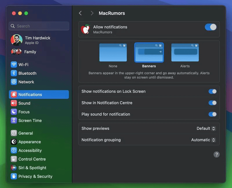 Nếu một trang web đã hỗ trợ thông báo đẩy trên web – giống như MacRumors – và bạn đã đăng ký với chúng, thì bạn sẽ nhận được thông báo đẩy của ứng dụng web hiển thị biểu tượng MacRumors tương ứng, cung cấp cho bạn nhiều ngữ cảnh hơn so với thông báo và biểu tượng tiêu chuẩn của Safari.