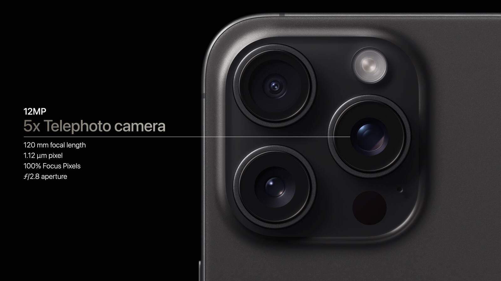 Đặc biệt camera tele của ‌iPhone 15 Pro‌ Max cung cấp khả năng zoom quang 5x ở tiêu cự 120mm với cảm biến lớn hơn 25%. Điều này được kết hợp với tính năng ổn định hình ảnh quang học và mô-đun dịch chuyển cảm biến 3D tự động lấy nét, mà Apple cho biết đây là hệ thống ổn định tiên tiến nhất của họ. Camera Ultrawide có lớp phủ chống phản chiếu mới, cũng như chế độ Ban đêm và Smart HDR được cải tiến.