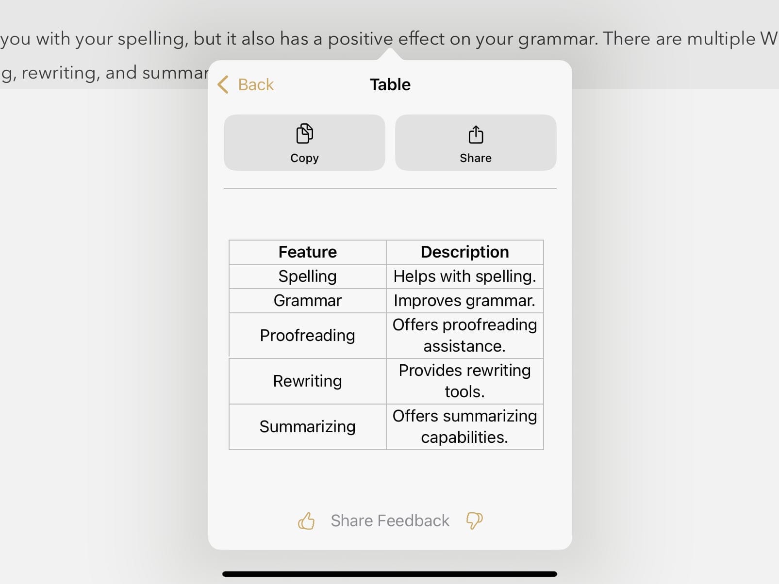 Tính năng Công cụ viết của Apple cải thiện khả năng viết bằng cách sửa lỗi chính tả và ngữ pháp, đồng thời cung cấp hỗ trợ hiệu đính, viết lại và tóm tắt.