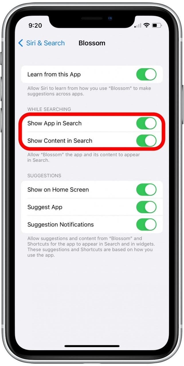 3. Để ẩn ứng dụng và nội dung của ứng dụng đó khỏi Tìm kiếm, hãy tắt Hiển thị ứng dụng trong Tìm kiếm và Hiển thị nội dung trong Tìm kiếm. Các nút chuyển đổi có màu xám khi bị tắt.