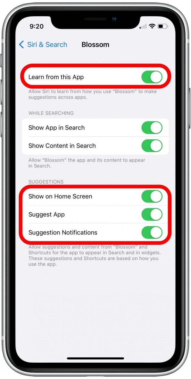 4. Để ẩn ứng dụng khỏi Đề xuất thông minh, hãy tắt Tìm hiểu từ ứng dụng này, Hiển thị trên Màn hình chính, Đề xuất ứng dụng và Thông báo đề xuất.