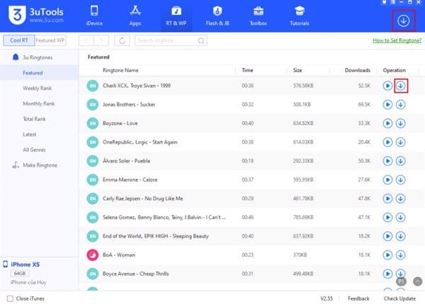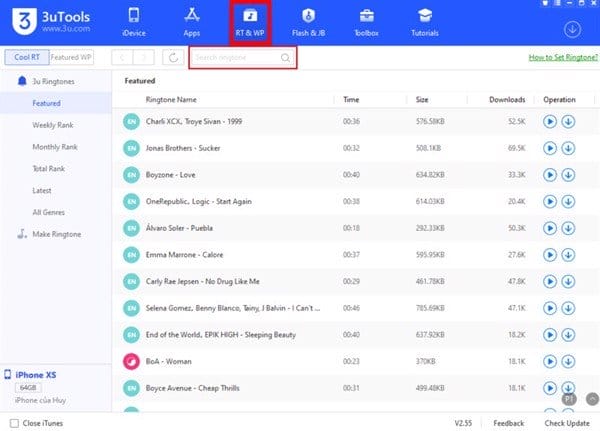 Bước 2. Mở 3uTools, bạn chọn mục RT & WP, tại đây, bạn có thể tìm kiếm các bản nhạc chuông hoặc chọn những bản đã có sẵn.