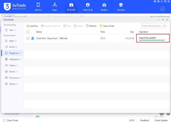 Bước 4. Nhấn vào mục Ringtones, bạn sẽ thấy nhạc chuông đã được tải về. Nếu ứng dụng thông báo Import Succeeded tức là đã thêm vào iPhone của bạn thành công.