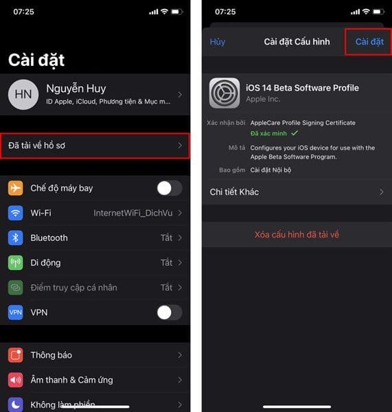 Bước 2. Thành công, bạn vào Cài đặt > Đã tải về hồ sơ > chọn Cài đặt cấu hình.