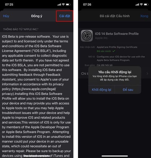 Bước 3. Bạn đồng ý với các điều khoản từ Apple Inc. và nhấn Cài đặt. Sau đó tiến hành khởi động lại máy.
