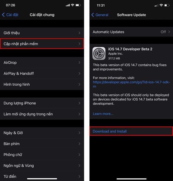 Bước 4. Vào Cài đặt chung > Cập nhật phần mềm > Tải về và cài đặt iOS 14.7 Developer Beta 2 là xong.