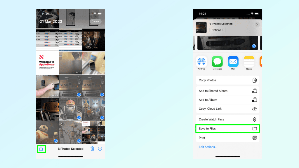 Bây giờ những hình ảnh đó cần được chuyển sang ứng dụng Tệp của iPhone. Với hình ảnh của bạn đã chọn, hãy nhấn vào biểu tượng Chia sẻ ở dưới cùng bên trái, sau đó là Lưu vào tệp.