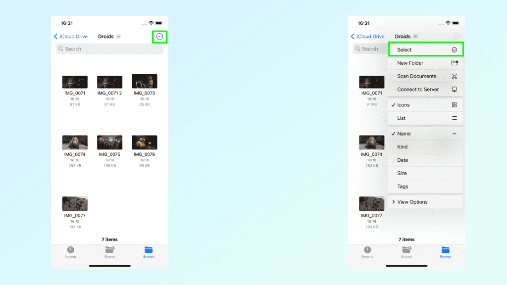 Gần như lặp lại bước 1, bây giờ bạn sẽ cần chọn những hình ảnh này trong ứng dụng Tệp. Điều hướng đến thư mục bạn vừa tạo và nhấn menu ba chấm ở trên cùng bên phải, sau đó Chọn. Sau đó chọn những hình ảnh bạn muốn chỉnh sửa.
