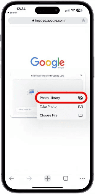 7. Bây giờ bạn sẽ sử dụng Google Lens trên iPhone để tìm kiếm một hình ảnh. Nhấn tải lên tệp hoặc dán URL hình ảnh.
