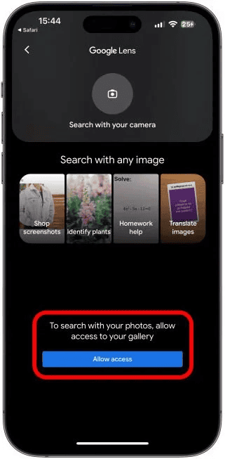 1. Điện thoại của bạn có thể tự động chuyển bạn sang Google Lens. Nếu không, hãy chuyển sang bước 5. Lần đầu tiên bạn làm điều này, bạn sẽ phải cho phép truy cập vào ảnh của mình. Để thực hiện việc này, hãy nhấn Cho phép truy cập và làm theo hướng dẫn trên màn hình.