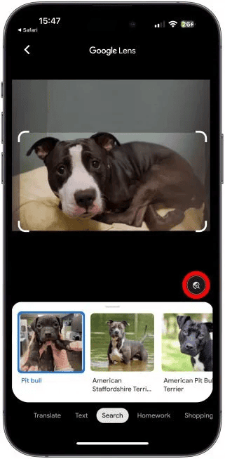 3. Tại đây, bạn sẽ thấy mọi thứ mà GoogleLens xác định, trong trường hợp này là giống chó của mình. Nhấn vào biểu tượng tìm kiếm.