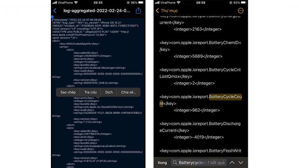 Bước 3: Sau đó, bạn chép toàn bộ dữ liệu trong log aggregated sang ứng dụng ghi chú và sử dụng công cụ Tìm trong ghi chú > Tìm kiếm dòng chữ BatteryCycleCount.