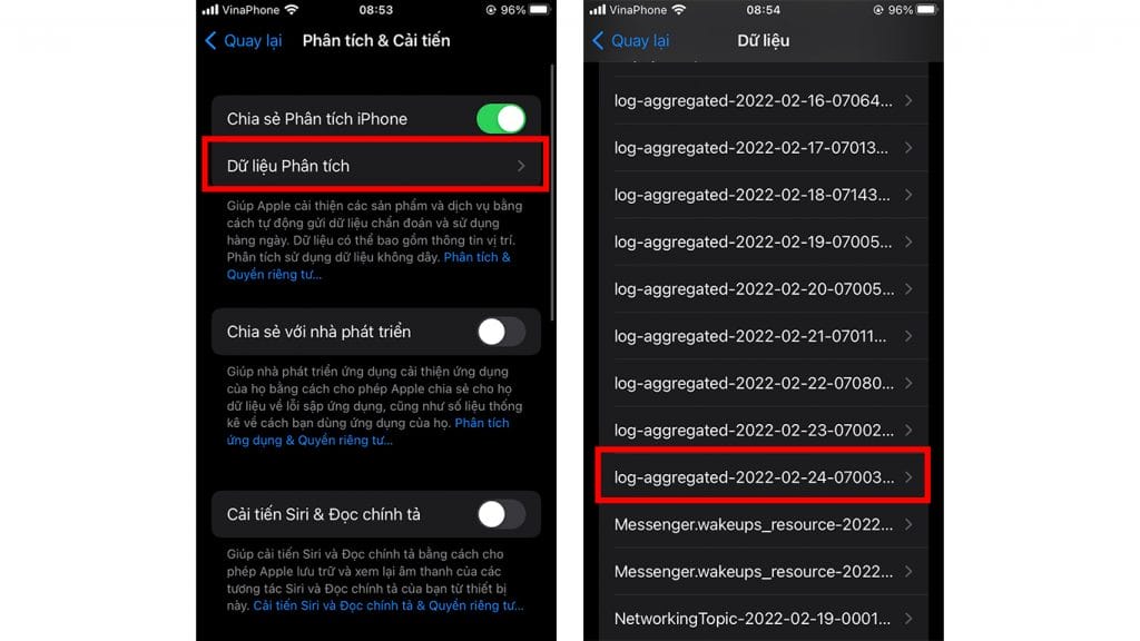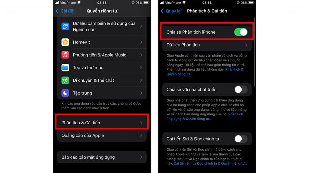 Bước 1: Nếu bạn chưa bật Chia sẻ phân tích trên iPhone thì cần phải đợi ít nhất 2 ngày để Apple có thể chuyển dữ liệu về máy tính của bạn. Để bật tính năng này bạn truy cập vào Cài đặt > Quyền riêng tư > Phân tích & Cải tiến > bật Chia sẻ Phân tích iPhone.