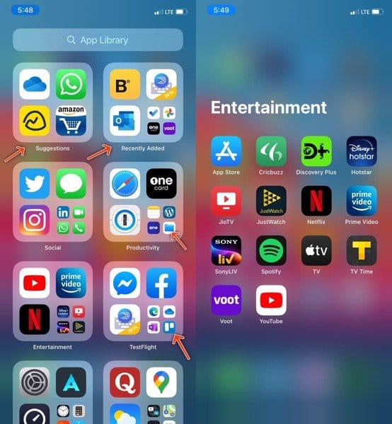 Bạn sẽ thấy rằng tất cả các ứng dụng và trò chơi mà bạn đã cài đặt trên iPhone đã được phân loại. Các danh mục hoặc thư mục này được iOS tạo tự động và khá chung chung, ví dụ như Giải trí, Xã hội và Năng suất, Tiện ích, Lối sống, Giáo dục, v.v. Apple sắp xếp các ứng dụng này dựa trên danh sách App Store của mình. Ví dụ: ứng dụng Netflix được liệt kê trong danh mục Giải trí trong App Store, vì vậy, nó sẽ chuyển đến thư mục Giải trí trong Thư viện ứng dụng. Amazon thuộc danh mục Phong cách sống trong App Store và đó là lý do tại sao bạn sẽ tìm thấy ứng dụng mua sắm phổ biến trong danh mục Phong cách sống.