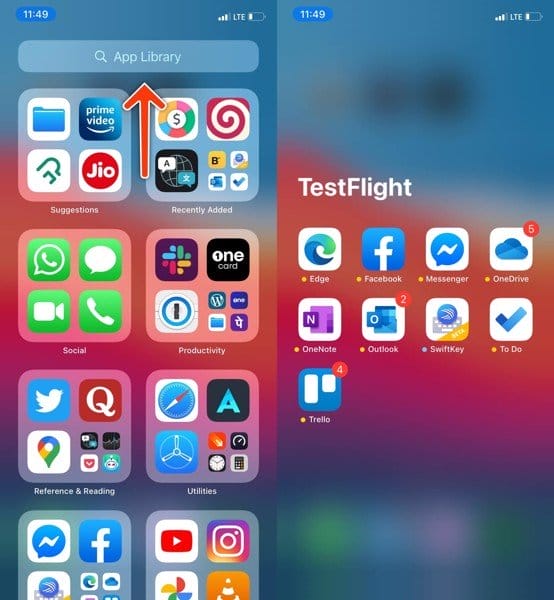 Người dùng không có quyền kiểm soát phân loại ứng dụng trong menu Thư viện ứng dụng. Và đó là lý do tại sao có thể khó hiểu khi tìm các ứng dụng có liên quan từ menu Thư viện ứng dụng. Rất may, Apple đã triển khai thanh tìm kiếm ở trên cùng trong menu Thư viện ứng dụng. Bạn có thể chỉ cần nhấn vào nó để bắt đầu gõ để mở ứng dụng.